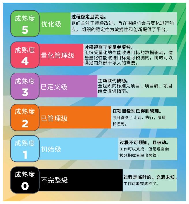 5、成熟度等级:与CMMI V1.3的成熟度等级非常相似: