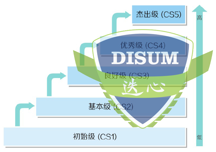 信息系统建设和服务能力划分为五个等级,等级从低到高分别用CS1级、CS2级、CS3级、CS4级和CS5级表示,并依次定义为初始级、基本级、良好级、优秀级和杰出级。