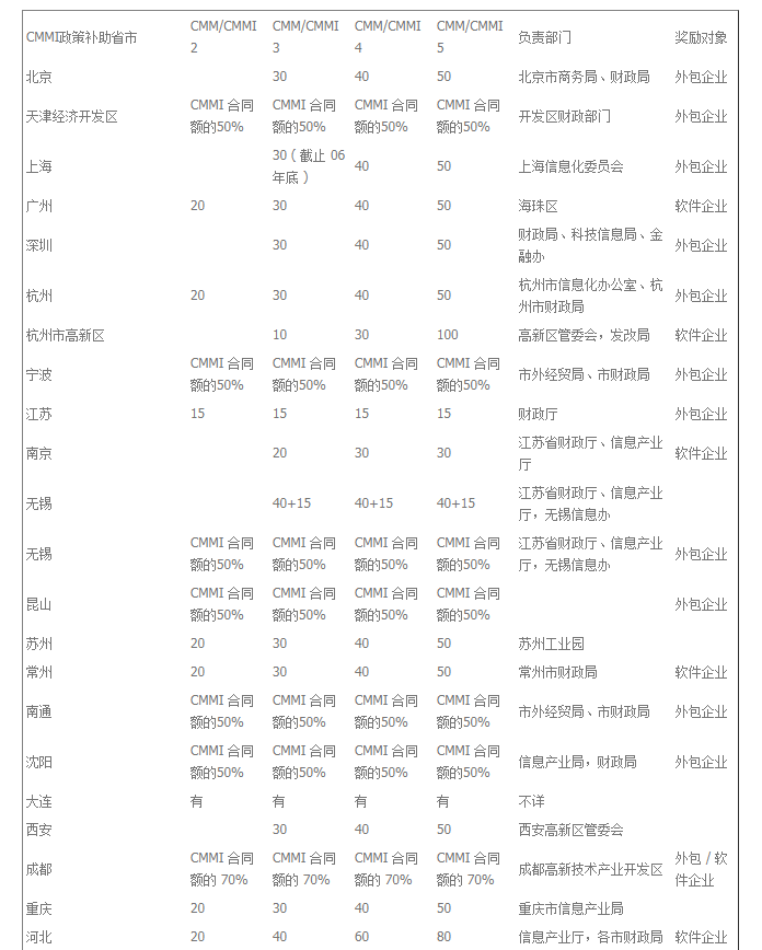 各省市CMMI政策补助,奖励文件政策补助如下: