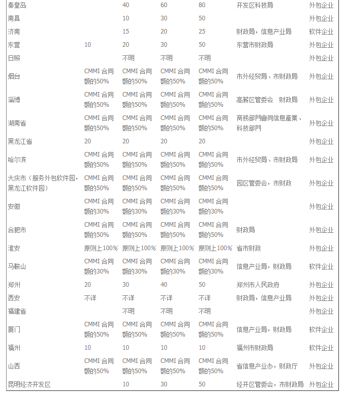 地方政府也加大了对服务外包企业的投入,在上海,北京,重庆,天津,江苏,浙江,广东等十几个省份、直辖市相应的政策,对通过国际认证(PCMM、CMMI等)的企业进行一次性配套奖励。