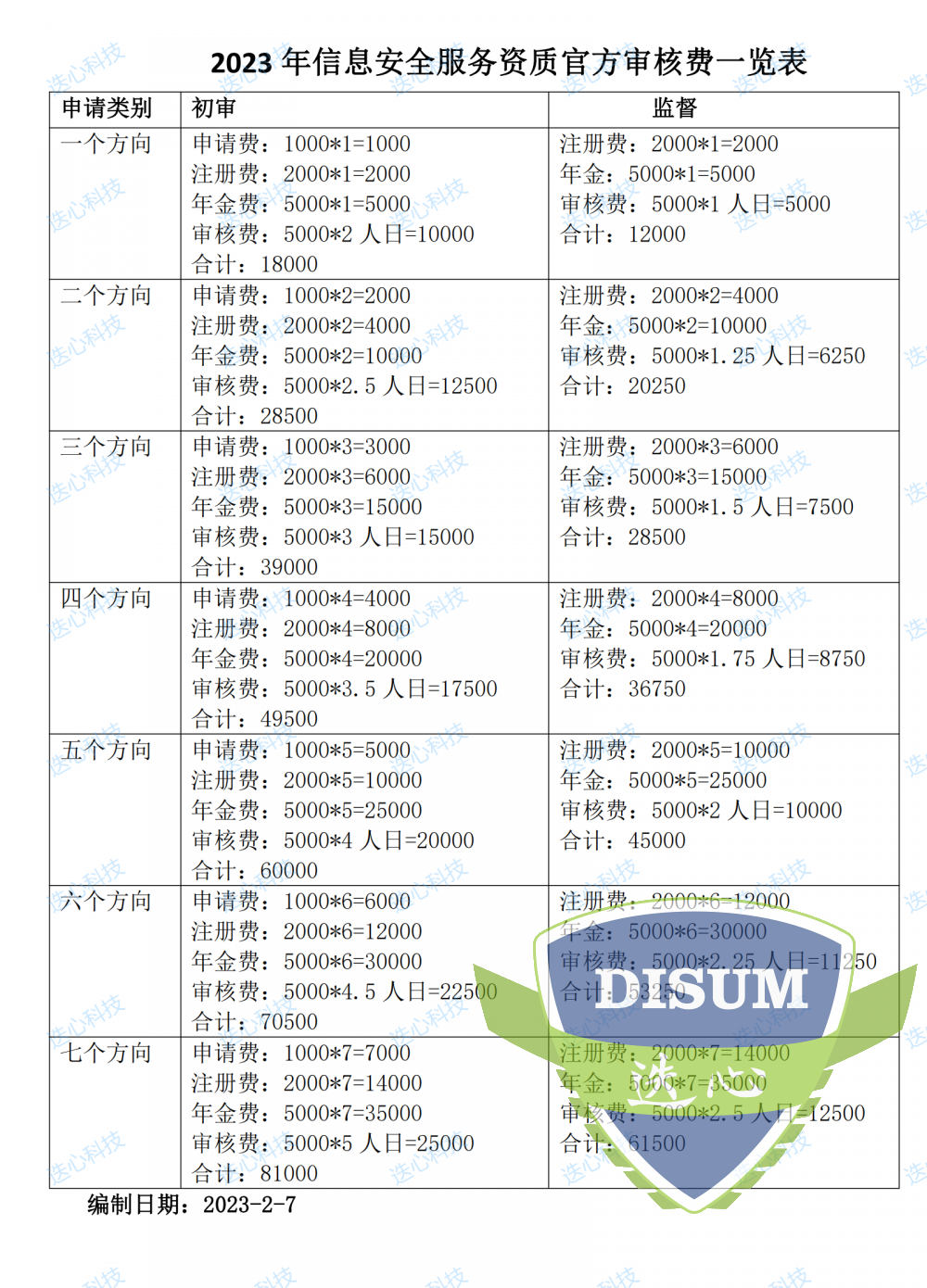 2023 年CCRC信息安全服务资质官方审核费一览表