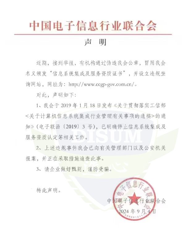 中国电子信息行业联合会发的—信息系统集成服务资质证书早就已经取消了!中国电子信息行业联合会在2019年1月18日发布了《关于贯彻落实工信部<关于计算机信息系统集成行业管理有关事项的通稿>的通知》(电子联函(2019)3号),已明确停止信息系统集成及服务资质认定等相关工作。目前市面上有人在发假证书,希望大家谨防假证书!目前有这几种假证书的情况。