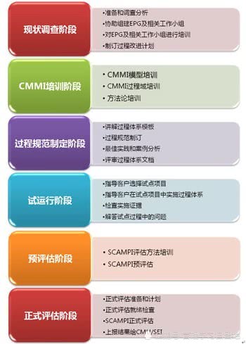 从申请CMMI认证到评估完成,往往要经历1年左右的时间,主要包括以下阶段: